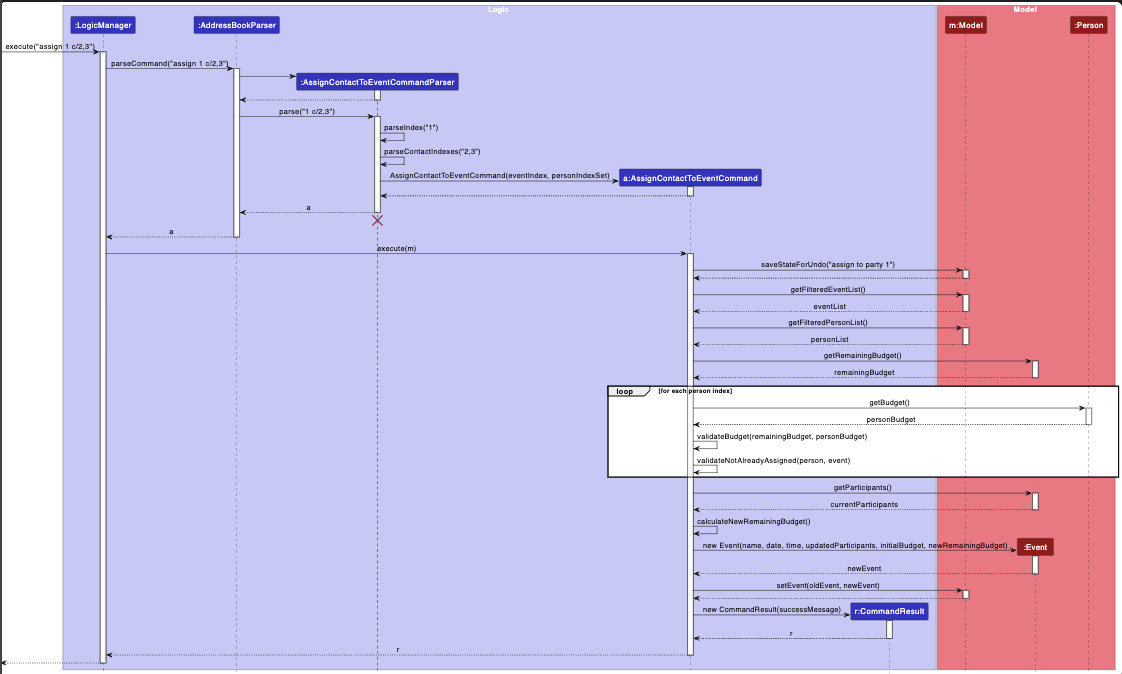 // Budget validation during assignment if (eventBudget < personBudget) { throw new CommandException("Budget exceeded"); } remainingBudget = eventBudget - personBudget; - Relationship Integrity:
